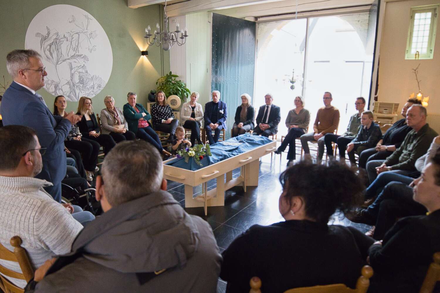 Deze entourage maakt het afscheid nog persoonlijker. De overledene centraal in het midden of nog in de rouwkamer om persoonlijk en intiem voor de laatste keer afscheid te nemen, voordat het definitieve afscheid volgt.