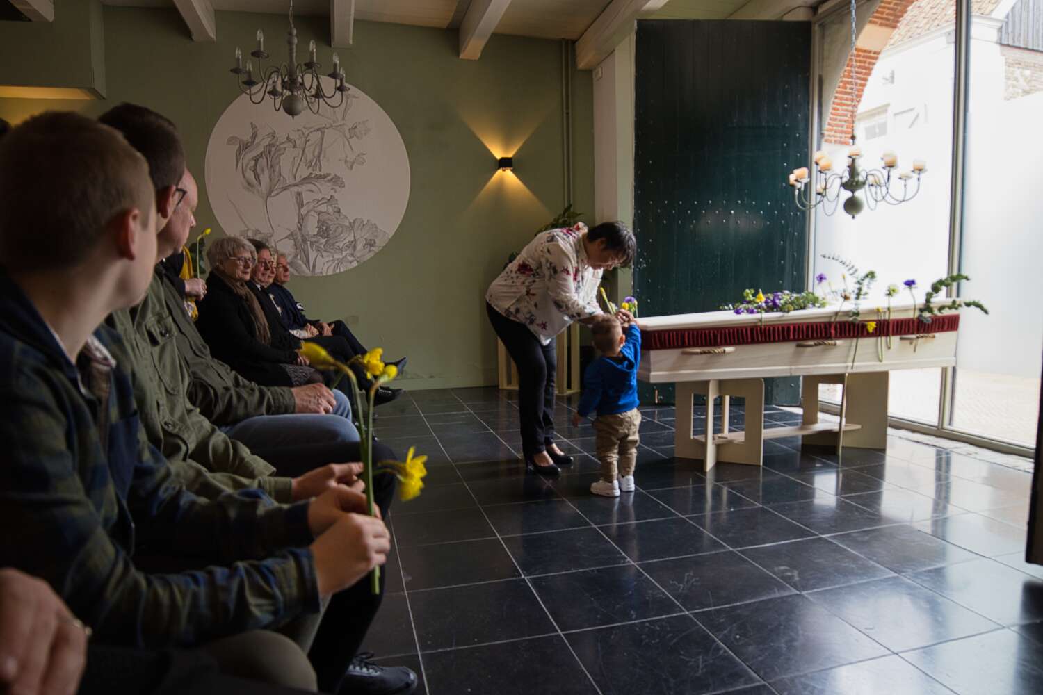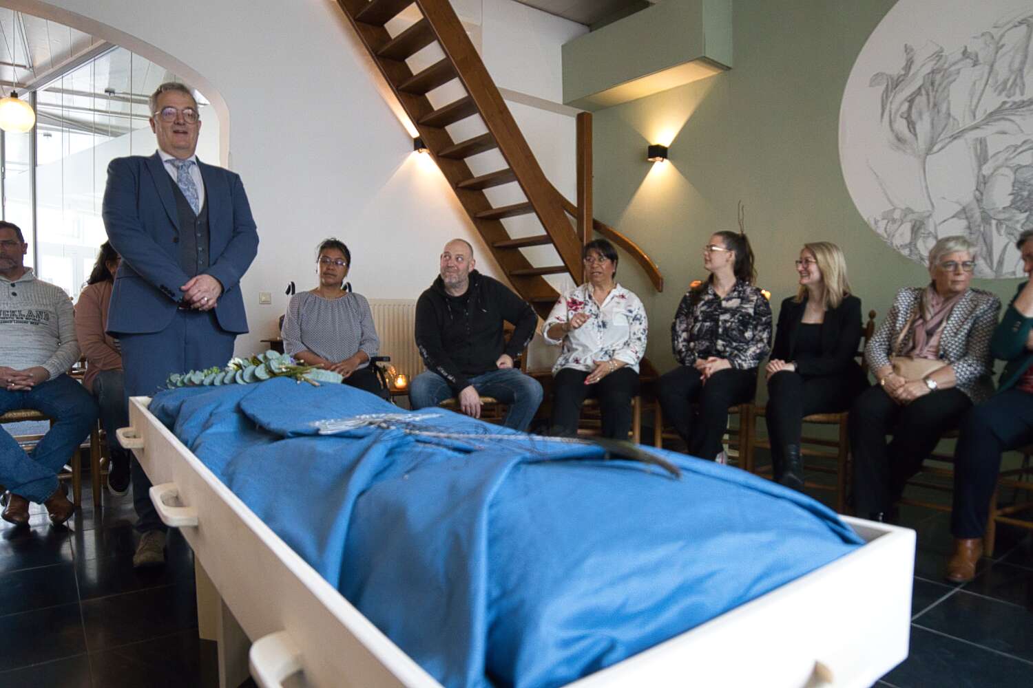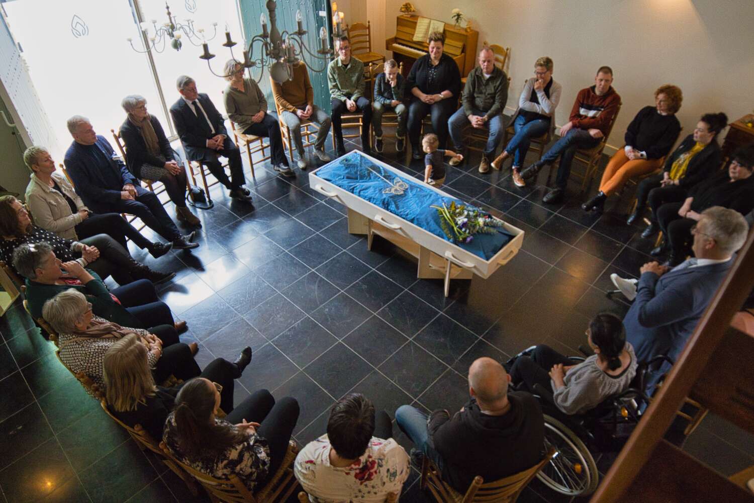 Deze entourage maakt het afscheid nog persoonlijker. De overledene centraal in het midden of nog in de rouwkamer om persoonlijk en intiem voor de laatste keer afscheid te nemen, voordat het definitieve afscheid volgt.