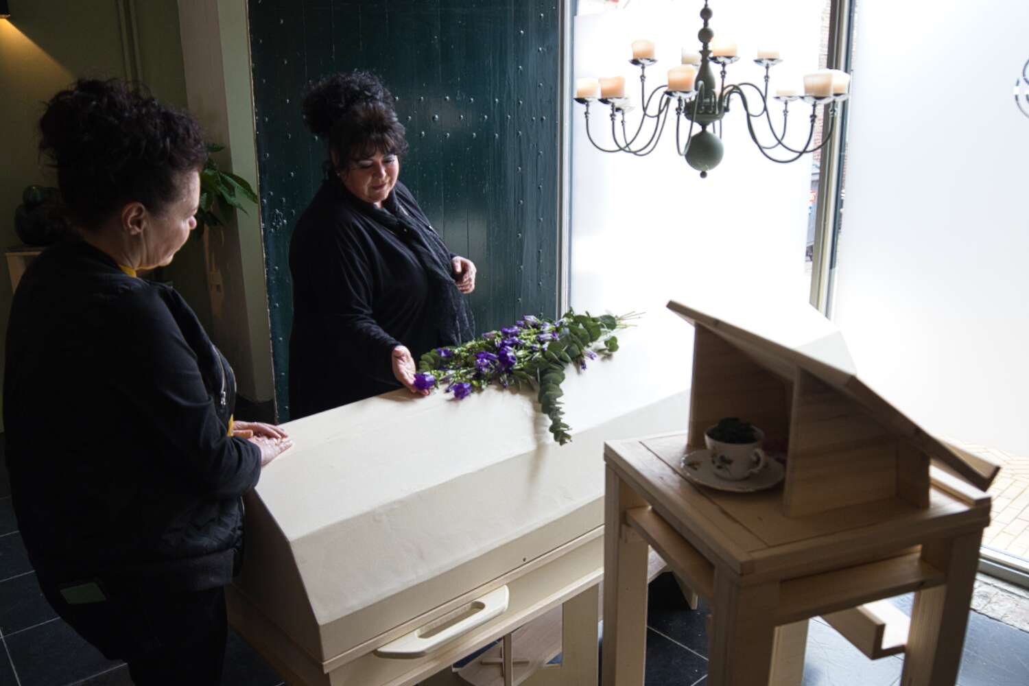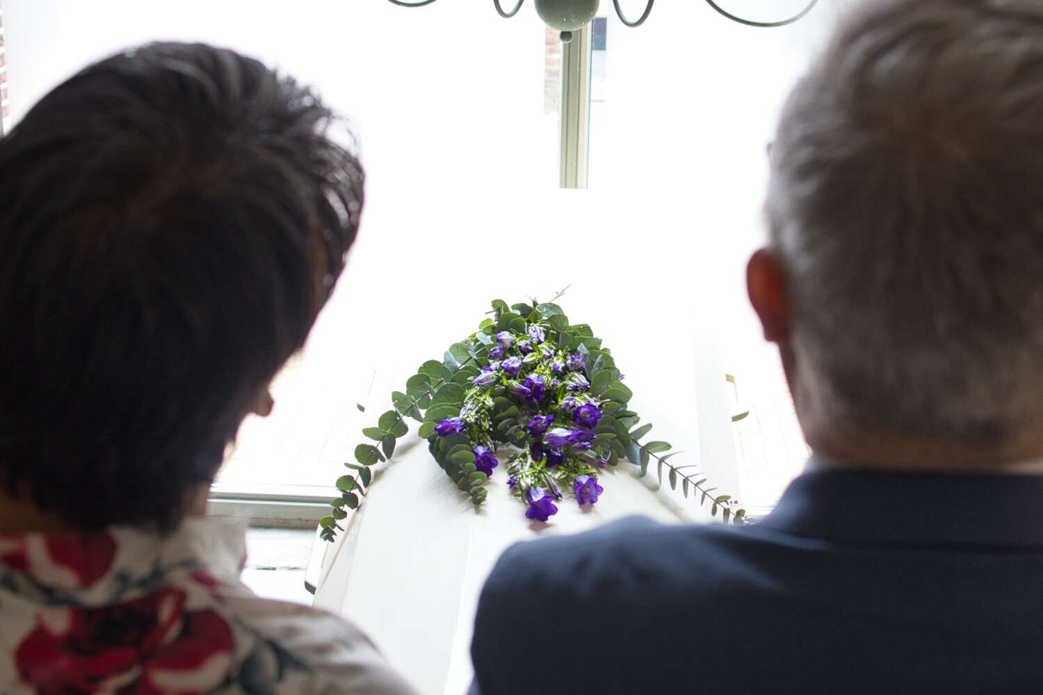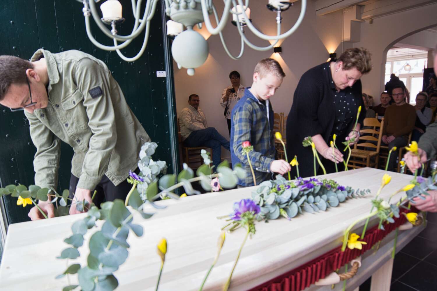 Deze entourage maakt het afscheid nog persoonlijker. De overledene centraal in het midden of nog in de rouwkamer om persoonlijk en intiem voor de laatste keer afscheid te nemen, voordat het definitieve afscheid volgt.